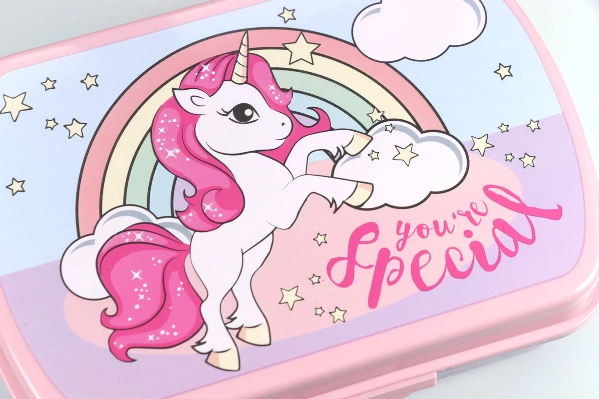 Hippe Unicorn lunchset voor kinderen! Deze set bestaat uit een roze met paarse unicorn afsluitbare broodtrommel waar makkelijk 4 boterhammen in passen voor school. De onderzijde van de broodtrommel is paars, op de roze deksel staat de favoriete print van veel jonge meisjes: de eenhoorn. Dit magische dier laat veel meiden stralen.