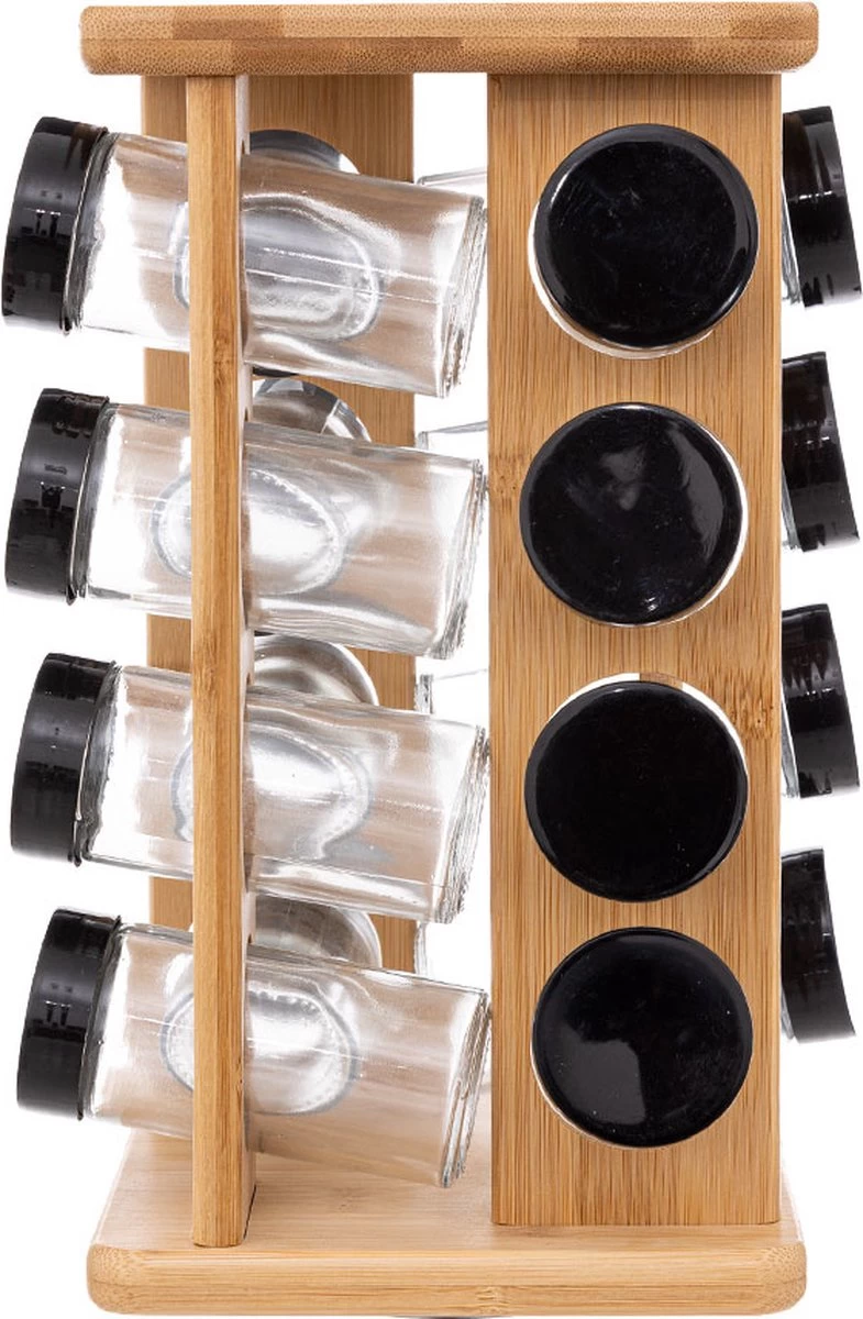 Kruidenrekje met 16 kruidenpotjes 29 cm van bamboe. Een complete set met 16 kruiden potjes en een houder. Elk potje is transparant zodat u goed kunt zien wat er in zit en de dop heeft 12 gaten om de kruiden goed te doseren, met drukdop. Afmeting: ca. 17,5 x 17,5 x 29 cm. Afmeting potje: ca. D4,5 x H10 cm. Reinigen: hand afwas en goed nadrogen. Materiaal: bamboe/glas.